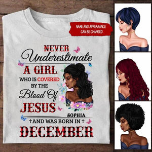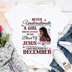 Personalized Birthday T Shirt, never underestimate a girl who is covered by the blood of jesus and was born in December, Her Birthday Gifts For December
