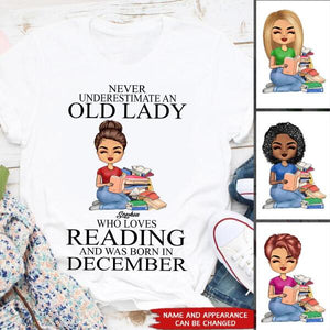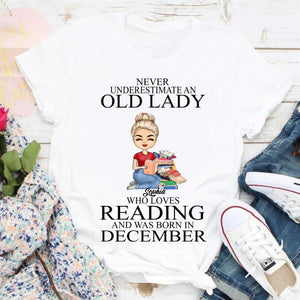 Personalized Birthday T Shirt, Never underestimate an Old Lady Who loves reading and was born in December, Her Birthday Gifts For December, Book Lover Shirt, Reading Gifts Cotton Shirt