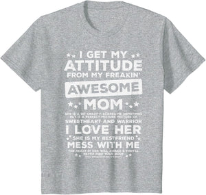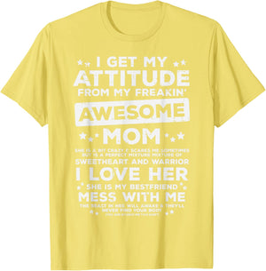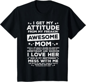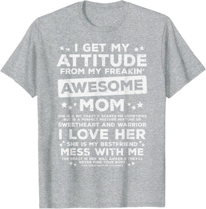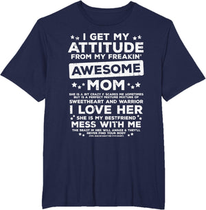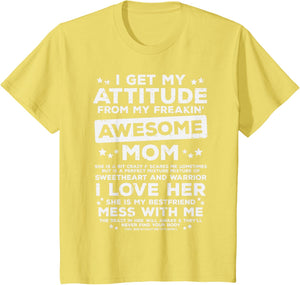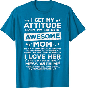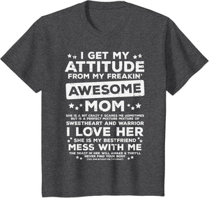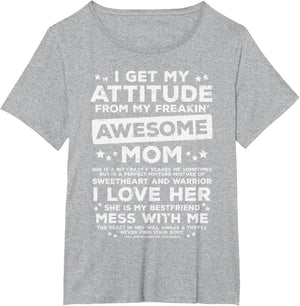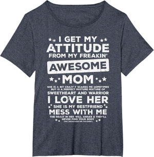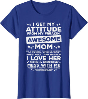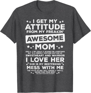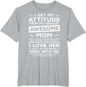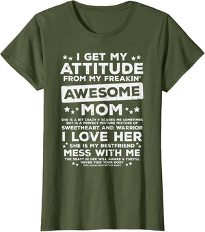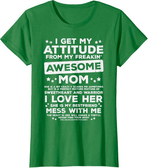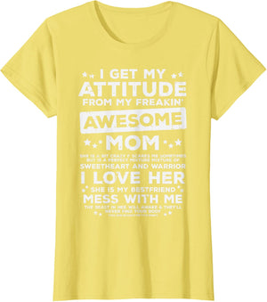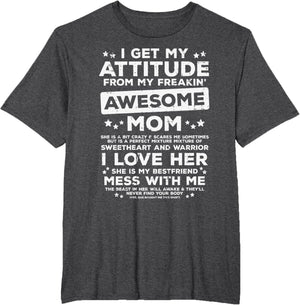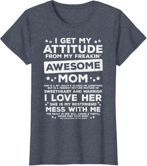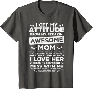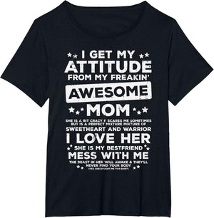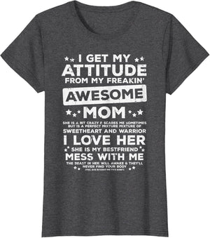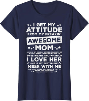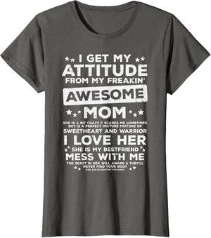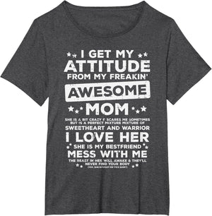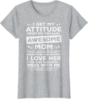 Grab this Got My Attitude From Awesome Mom T-Shirt as a gift for your best mom, mama, mommy, stepmom, mother-in-law, aunt, grandma or wife! Perfect happy mother's day gift from daughter, son, stepdaughter, stepson, kids or husband