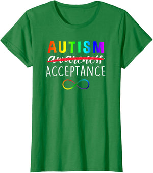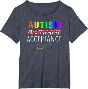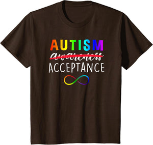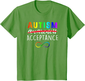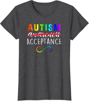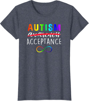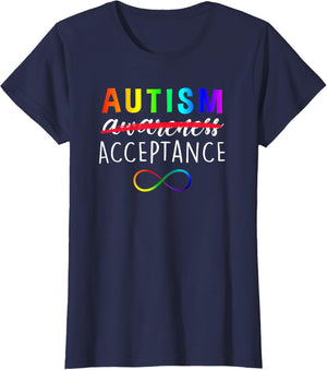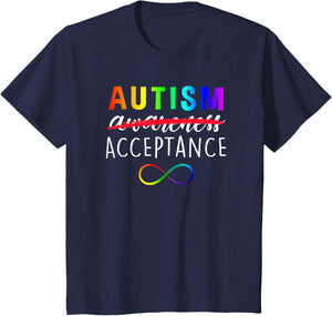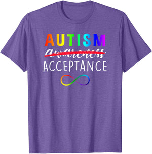 • Show support for Autism and its acceptance with this colorful advocacy t-shirt featuring a rainbow colored infinity symbole and the phrase, "Autism Acceptance". The word "awareness" is crossed out demonstrating that awareness is not enough.