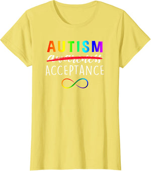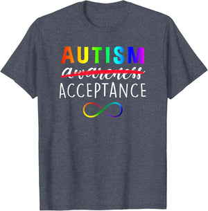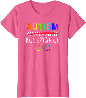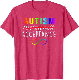 Show support for Autism and its acceptance with this colorful advocacy t-shirt featuring a rainbow colored infinity symbol and the phrase, "Autism Acceptance". The word "awareness" is crossed out demonstrating that awareness is not enough. Give a gift of love, acceptance and support. Makes a great gift for teachers, caregivers, and family members working with, loving and supporting autistic children and adults.